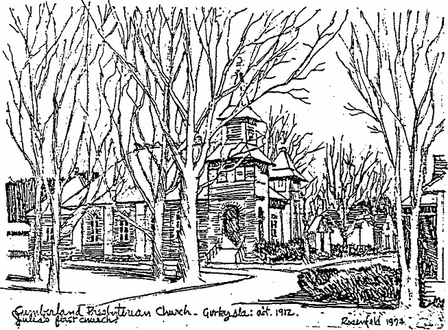 November 12, 1987. A summary write-up/sketch is shown below. The sketch was done by Mr. Ed Rosenfeld as his l974 Christmas Card in honor of his wife, Julia, and her first church.