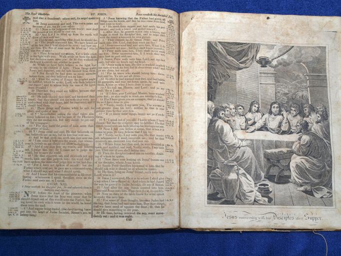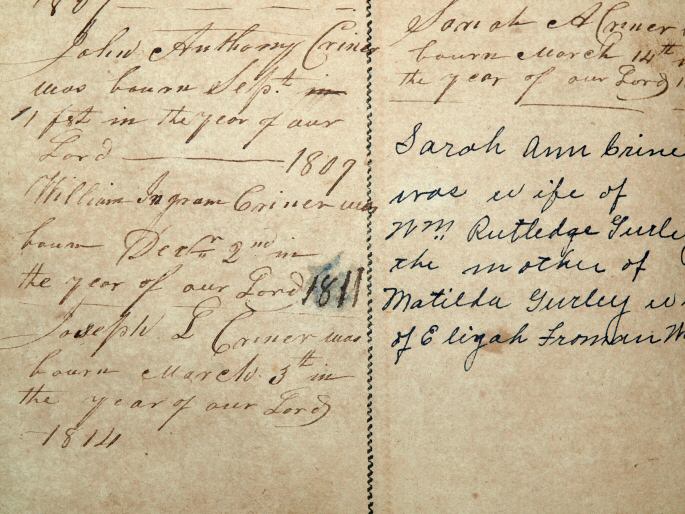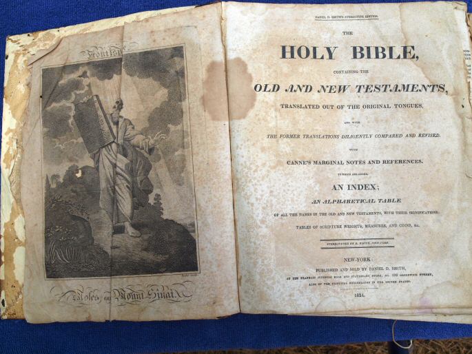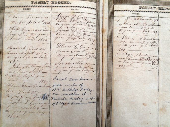 A rare find was recently made of two lost Criner Family treasures. Included in some of the articles removed from trunks stored in the old Capt. Elijah F. Walker house on Gate Street in Gurley, was an old family bible bound in leather and printed in 1824. As of 2010, this bible is 186 years old. It was discovered that this was the Joseph Criner family bible owned by Joseph and his wife Eleanor Ingram Criner. The Criner Bible measures 9" x 11" x 3"