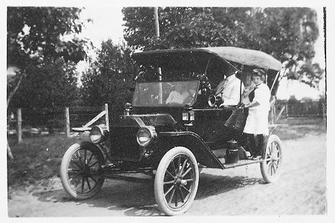 Families loved to have group photos taken sitting in their new T Model Ford automobiles. Dirt roads made the riding rough but to these early automobile